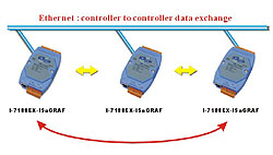 | 象I-8437/8837控制器一样,I-7188EG也可以通过Ebus(Ethernet网络)的软件通讯协议与其他控制器进行对话。示意图(链接)如下: